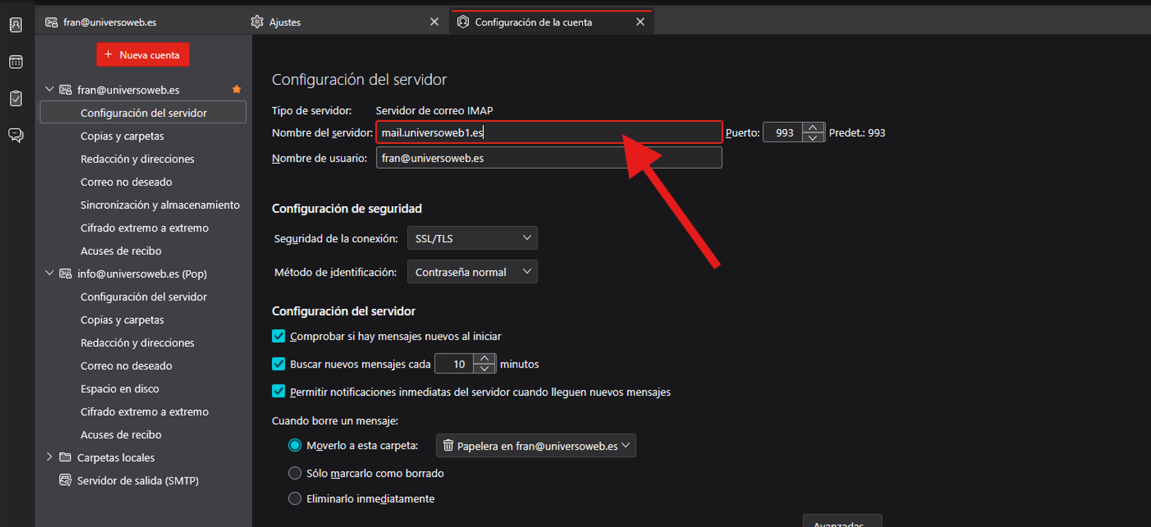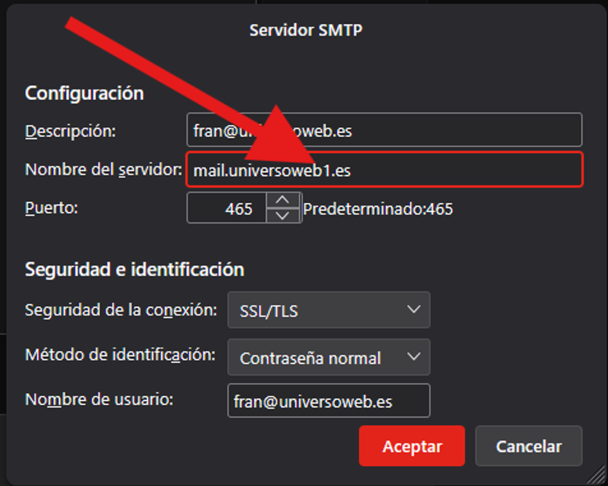 3º Tras eso, pincharemos en Configuración del servidor y cambiaremos el www.universoweb.es por mail.universoweb1.es, tal y como aparece en la imagen.