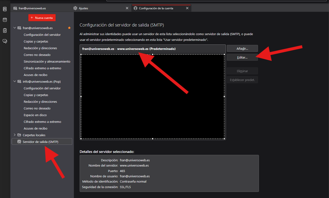 4º Seguidamente pincharemos en Servidor de salida (SMTP), marcamos el correo que queremos configurar y le damos al botón Editar.